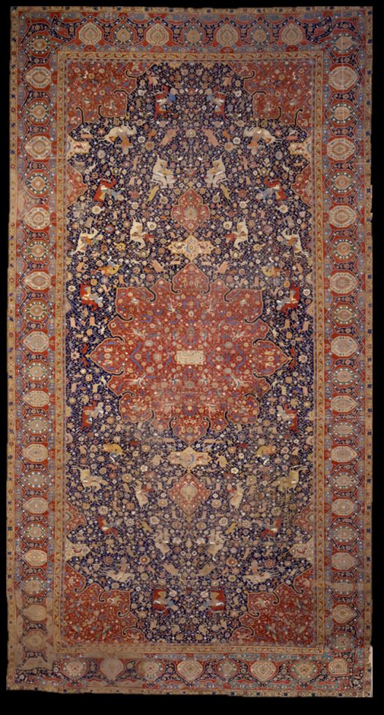 Upon closer inspection of the carpet’s pattern, one can discern four perfectly symmetrical sections depicting a hunting scene. In this hunting ground, seven horseback riders and one pedestrian hunter seek various animals, including lions, antelopes, bears, lynxes, cheetahs, and boars. A keen eye will reveal additional details such as deer and falcons lurking near hares.