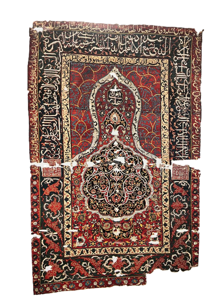 In the Safavid era in Iran, what we now recognize as “Sajjadeh carpets” were referred to as “Janmazi” and “Mihrabi.” During that period, Janmazi or Mehrabi carpets were the terms used. The mihrab, a recess in the middle of the mosque wall in Islamic architecture, indicates the Qibla’s direction and is typically situated on the south side of the mosque wall in Iran. Essentially, the mihrab functions as the heart of the mosque, showcasing elaborate Iranian and Islamic arts such as Moqarnas and calligraphy. Despite some damage, this small carpet remains beautiful. Museum records and Arthur Upham Pope’s book, “A Survey of Persian Art,” trace the origin of this carpet to Tabriz in northwest Iran. Nevertheless, the presence of the Persian knot suggests the possibility that this “sajjadeh” was woven in central Iran, perhaps Kashan or Isfahan. Carpets and rugs have been produced in Kashan since before the Safavid era, but the mass production of finely woven, expensive, high-quality silk carpets began during the Safavid period. This era witnessed a particular emphasis on art, with Kashan recognized for its cultural and religious significance. Among the initial designs predating Islam were Islamic and Mihrabi patterns. Over time, these designs not only found their way into rugs and carpets but also significantly influenced book design and tile making. This sajjadah, employed for Islamic worship, is adorned with Sermeh silver thread, while Arabic surahs from the Quran adorn its edges.
