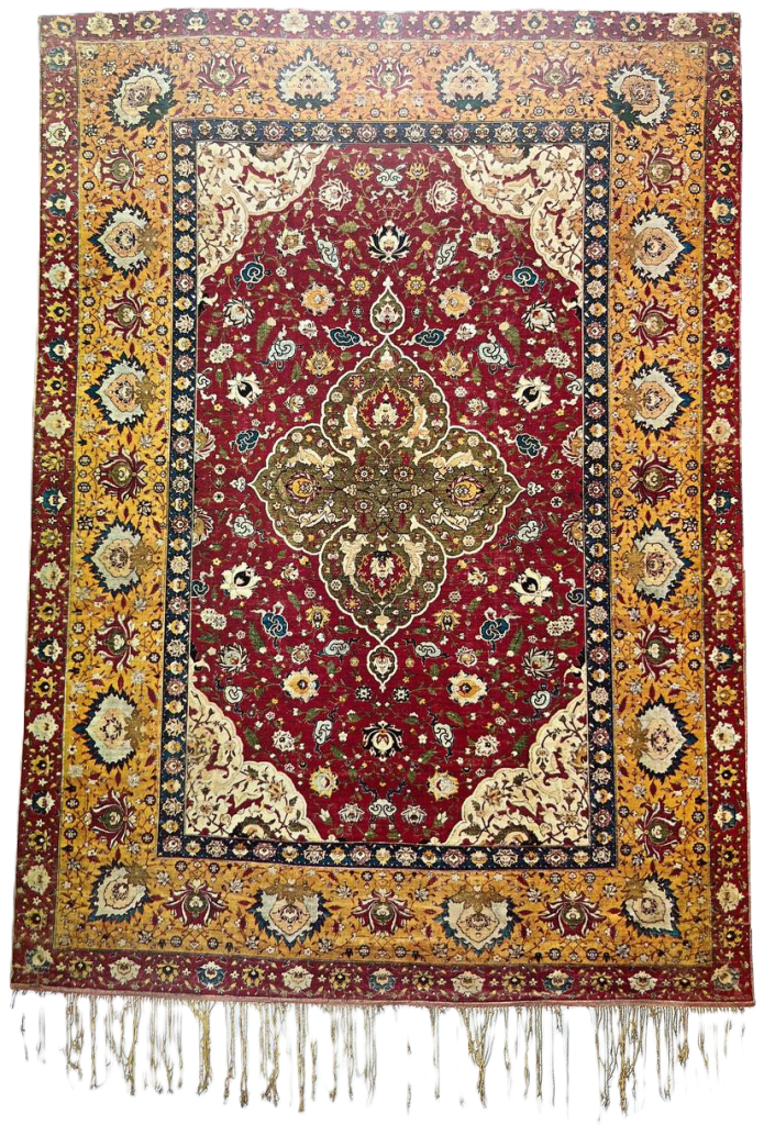 This carpet stands out as one of the most exquisite silk carpets from the Safavid era, with a comparable example housed in the Metropolitan Museum of New York.